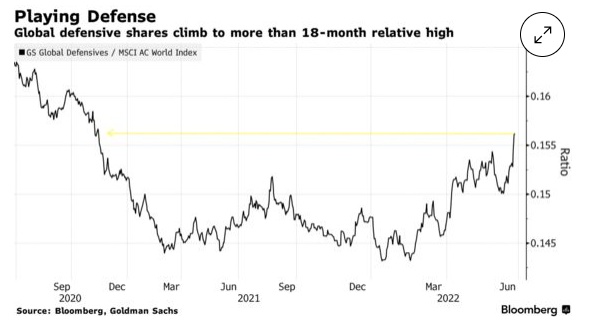 智通财经APP注意到,高盛的防御型股票指数(成分包括大型科技股以及医疗股)与摩根士丹利的MSCI AC World指数的比值已攀升至18个多月来的高点,其背后的原因是市场对全球经济衰退的担忧超过了对通胀高企的担忧。
