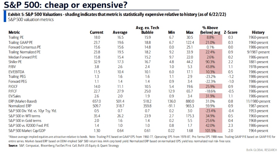 该行策略师Savita Subramanian表示,当前标普500指数的跟踪市盈率为18.1倍,而历史熊市底部时的平均市盈率为12.3倍。此外,2010年代最看涨的指标转为看跌:标普500指数股息收益率与10年期美国国债收益率之比急剧下降至0.5倍,而平均水平为0.7倍(新冠疫情期间峰值为3.2倍)。