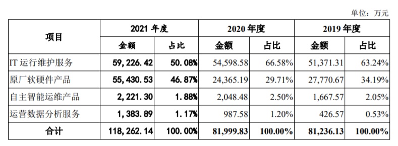 其中,作为公司的核心业务,IT 运行维护服务总体是公司收入占比最高的业务。于2019、2020、2021年度,公司IT运行维护服务收入分别为5.14亿元、5.46亿元和5.92亿元,占主营业务收入的比例分别为63.24%、66.58%和50.08%。公司主营业务收入构成情况如下: