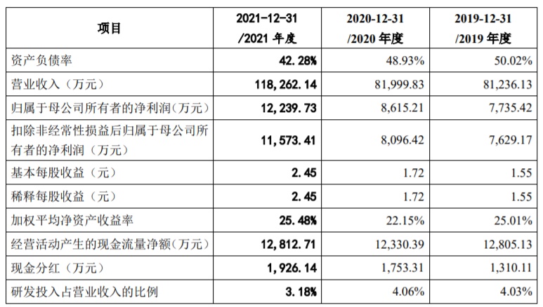 财务方面,于2019、2020、2021年度,公司营业收入分别为8.12亿元、8.20亿元和11.83亿元,均来自于主营业务收入,公司主营业务突出。