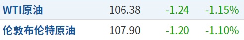 截至发稿,WTI原油期货价格跌1.15%,报106.38美元/桶;布伦特原油期货价格跌1.10%,报107.90美元/桶。