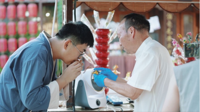 跟随着主播们的脚步,直播间中的观众们一同在梦唐阁的科举考试地、春江花月夜、缘聚堂、大理寺等经历了与场景相关的传统非遗游戏,欣赏了花魁带来的优美舞姿,体验了吹糖人等民间手工艺术,得知了“洛阳纸贵”、“洛阳红”等词语的由来。