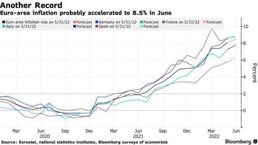 论坛结束两天后的周五,欧元区将公布6月的通胀数据。预计该数据可能创下历史新高,有经济学给出的预测是8.5%。