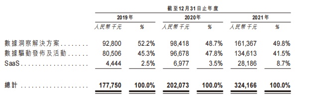 业务方面,数据洞察解决方案业务和数据驱动发布及活动业务是中康控股的两项核心业务。后者是通过产业活动交付的健康洞察解决方案,是一项实施服务,前者则是一项技术和软件服务。报告期内,上述两项业务合计贡献营收分别为1.73亿元、1.95亿元、2.96亿元,占总营收的比例分别为97.6%、96.5%、91.3%。同一时期,SaaS业务的收入分别为444.4万元、697.7万元及2818.6万元,分别占总营收的2.5%、3.5%及8.7%。简言之,中康控股的业务结构较为单一,数据洞察解决方案贡献营收近五成,SaaS业务尚不能形成规模。