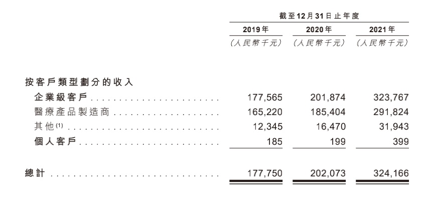 然而,从客户分布情况来看,中康控股的大部分收入来自医疗产品制造商客户,客户覆盖广度有所不足。报告期内,产生自医疗产品制造商客户的收入分别为1.65亿元、1.85亿元及2.92亿元,分别占同期收入的93.0%、91.8%及90.0%。和医渡科技丰富的客户类型比如医院端和政府端相比,中康控股的客户潜在增长空间略显不足。该公司亦在招股书中提示,若而该等客户对健康大数据解决方案的需求增长放缓或大幅减少,均可能会对公司的业务、经营业绩及前景产重大不利影响。