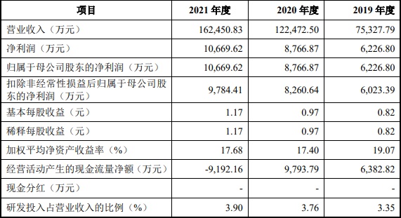 财务方面,最近三年,公司经营业绩实现较快增长,营业收入从2019年约7.53亿元增长至2021年约16.25亿元,最近三年营业收入复合增长率达到46.85%;净利润从2019年6226.80万元增长至2021年约1.07亿元。