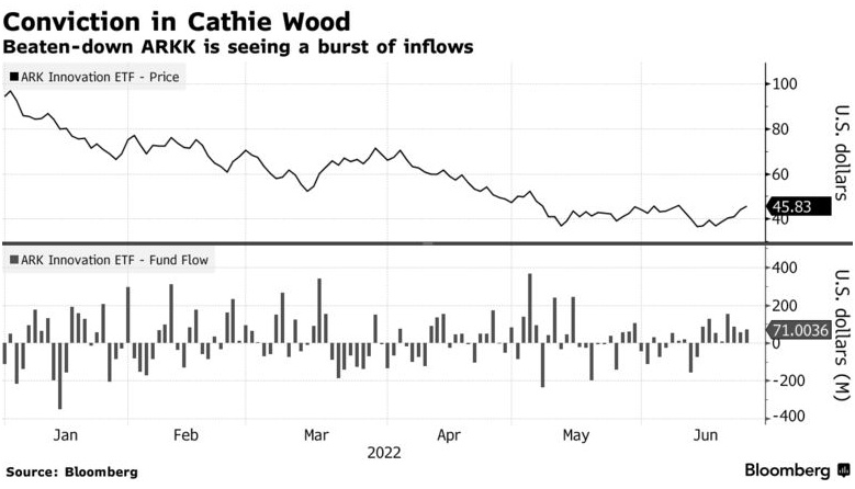 虽然该基金的资金流入量低于此前,但资金流入这一现象表明投资者对伍德充满信心。这只ETF在过去两周上涨了14%,但仍较峰值下跌了70%以上,其原因是它面临着通胀高企和美联储加息的压力。