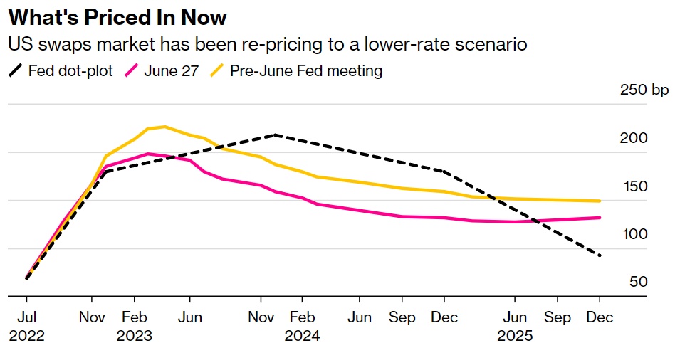 以Praveen Korapaty为首的策略师在6月24日的一份报告中称,尽管过去几周市场对美联储政策利率的隐含预期已降至2023 年初“下行空间有限”的水平,但市场对2024年联邦基金利率定价可能低估了衰退的风险。他们表示,通胀居高不下的风险令经济衰退担忧对美国国债收益率曲线的影响复杂化。