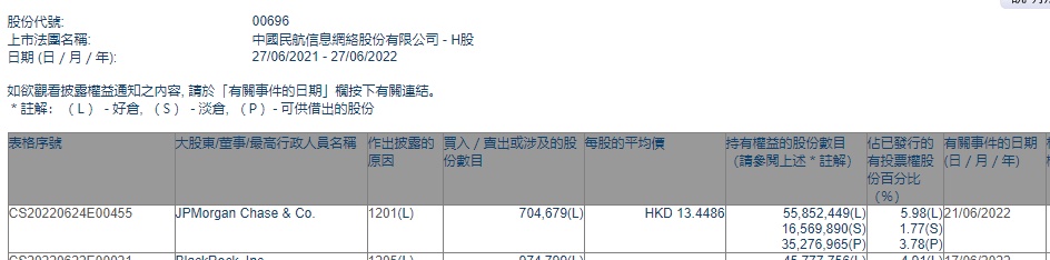 智通财经APP获悉,香港联交所最新资料显示,6月21日,小摩减持中国民航信息网络(00696)70.4679万股,每股作价13.4486港元,总金额约为947.69万港元。减持后最新持股数目约为5585.2万股,最新持股比例为5.98%。