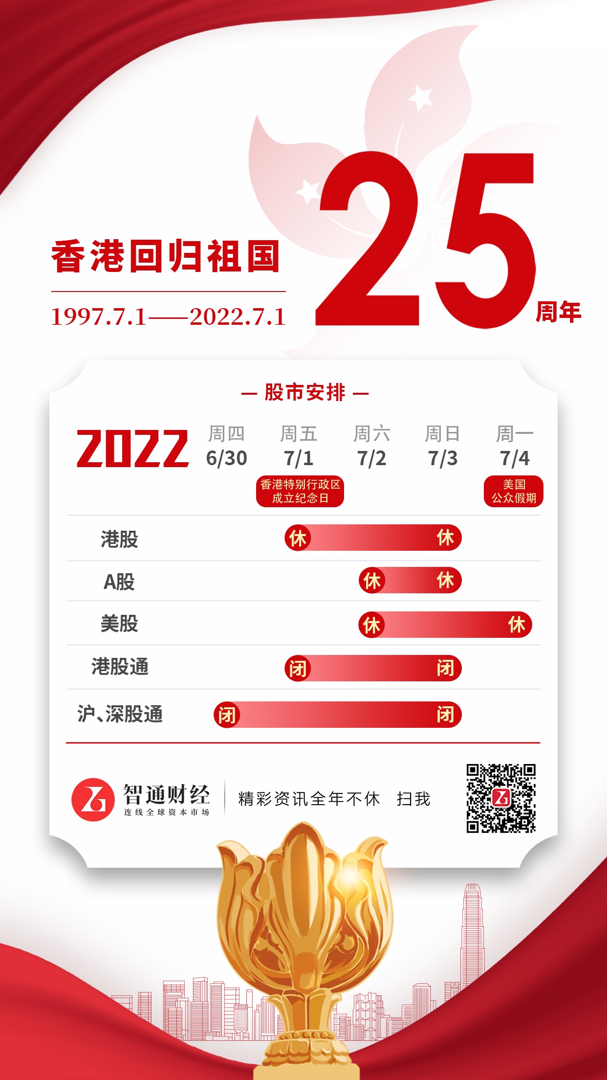 智通财经APP获悉,7月1日(本周五)为香港特别行政区成立纪念日,港股休市一天,7月4日(下周一)恢复正常交易。