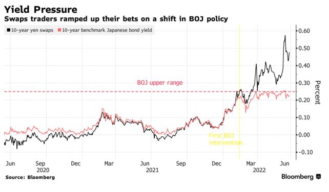 日本债券市场今年受到投机客越来越大的压力,他们押注日本央行将不得不改变维持10年期公债收益率上限的政策,以提振疲弱的经济。6月中旬,在债务抛售潮中,期货交易一度濒临停牌,而掉期市场的价格反映出日本央行对10年期日债将突破0.25%的底线。