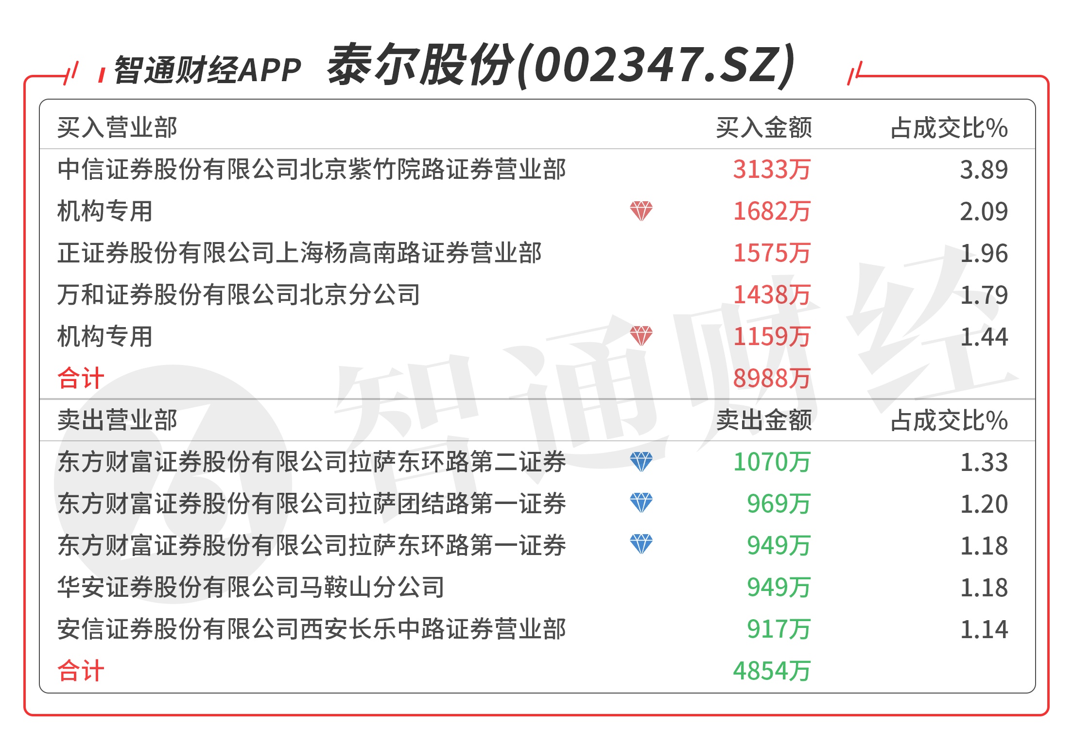 泰尔股份(002347.SZ):多主力现身龙虎榜,机构席位买入2078万元,买一是知名游资的席位买入3132万元,当日净买入5568万元,该股今日反包涨停,预计压力位在近期高点附近。