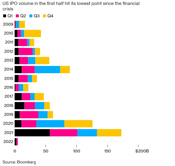 智通财经APP获悉,2021年,大量公司无视疫情以创纪录的速度上市。而在今年,市场波动、通胀高企以及对经济下行的担忧令美股IPO市场迅速冷却。根据彭博汇编的数据,2022年上半年美股IPO筹集到的总资金仅为49亿美元,不及2021年同期筹集的近1020亿美元的6%。尽管2021年的数值是由特殊原因造成的异常值,但今年上半年的筹资额仍远低于近五年平均水平的470亿美元。