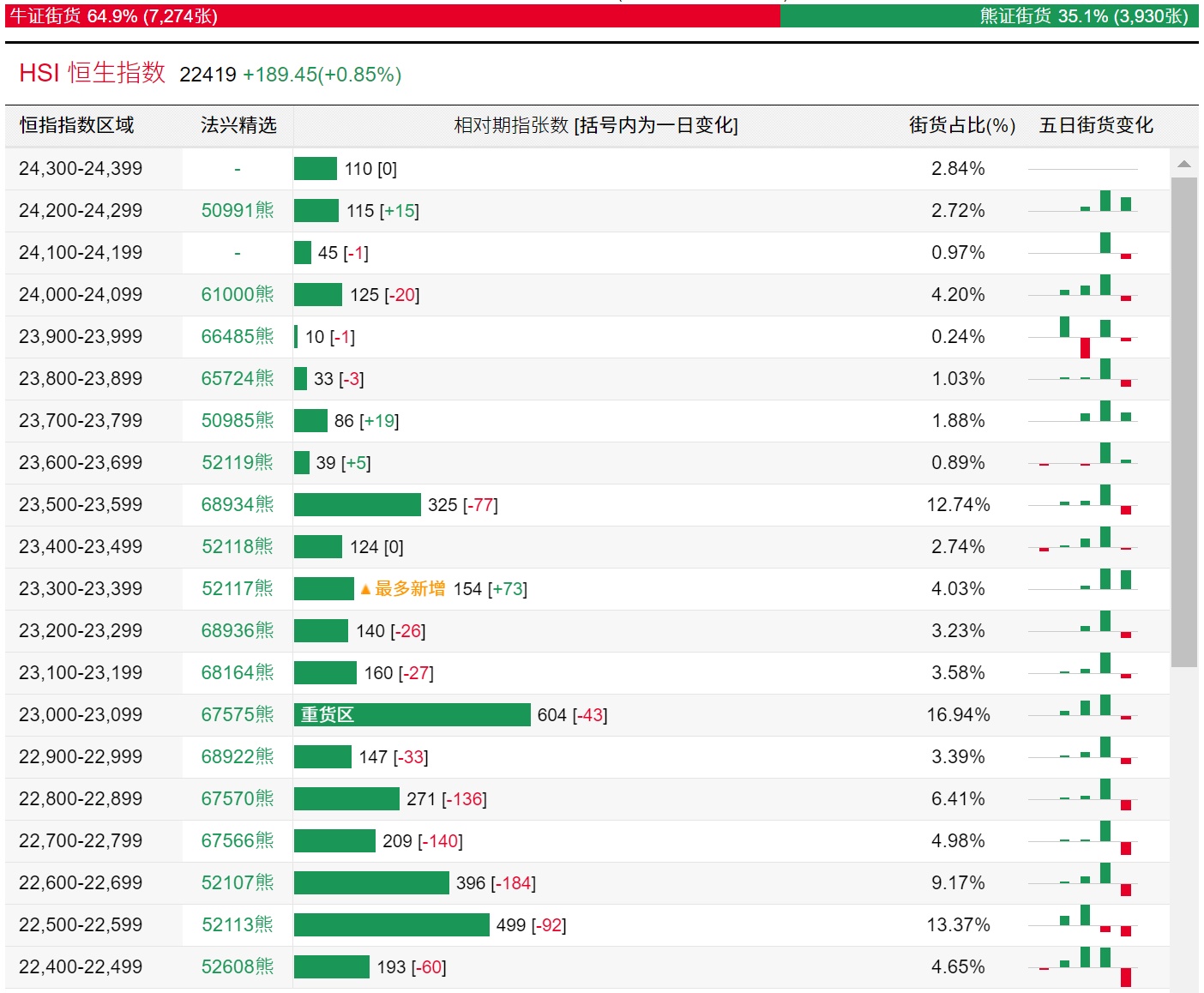 法兴恒指牛熊证街货分布图中的数据显示,熊证街货重货区在23000-23099区间,该区间最新熊证数量为604张,较上一交易日减少43张;最多新增在23300-23399区间,该区间最新熊证数量为154张,较上一交易日增加73张。