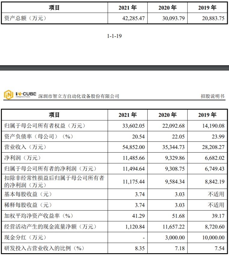 财务方面,于2019年度、2020年度、2021年度,公司营业收入分别为 2.8208亿元、3.5345亿元和 5.4852亿元,最近三年年均复合增长率39.45%,同期净利润分别为6682.02万元、 9329.86万元和1.1486亿元,最近三年年均复合增长率31.11%。