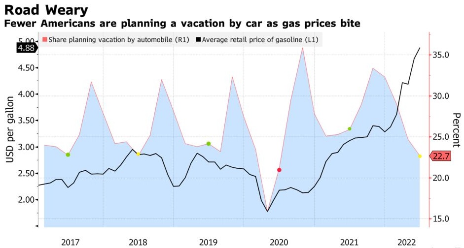在夏季伊始,尽管成本更高,预订旅行的人越来越多。但市场预期已久的需求下降迹象可能即将出现,分析师将度假计划放缓归因于汽油价格过高。在美国汽油零售价徘徊在平均每加仑5美元的情况下,消费者根本无法得到喘息的机会。