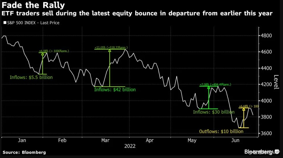 智通财经APP获悉,美股反弹5%的趋势未能持续下去。每次反弹都会吸引数十亿美元流入ETF,但这一次的情况有所不同。
