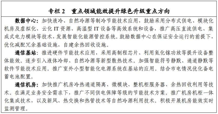 (二)推进重点领域能效提升绿色升级。持续开展国家绿色数据中心建设,发布名单及典型案例,加强绿色设计、运维和能源计量审查。引导数据中心扩大绿色能源利用比例,推动老旧数据中心实施系统节能改造。支持制造企业加强绿色设计,提高网络设备等信息处理设备能效。推动低功耗芯片等产品和技术在移动通信网络中的应用,推动电源、空调等配套设施绿色化改造。到 2025 年,新建大型、超大型数据中心电能利用效率(PUE,指数据中心总耗电量与信息设备耗电量的比值)优于 1.3。