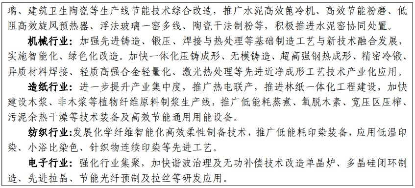 (一)推进重点行业节能提效改造升级。深入挖掘钢铁、石化化工、有色金属、建材等行业节能潜力,有序推进技术工艺升级,推动能效水平应提尽提,实现行业能效稳步提升。针对机械、造纸、纺织、电子等行业主要用能环节和设备,推广一批关键共性节能提效技术装备,加快提升行业能效。鼓励企业加强能量系统优化、余热余压利用、可再生能源利用、公辅设施改造等。