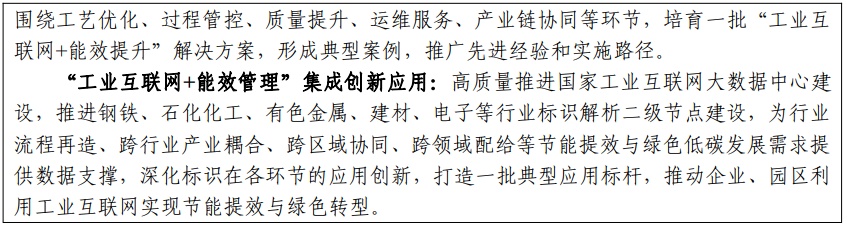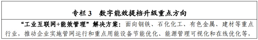 (十八)提高“工业互联网+能效管理”创新能力。面向重点行业领域探索“工业互联网+能效管理”典型应用场景,加快新技术新产品的测试认证,逐步完善重点行业数字能效提升全景图,打造解决方案资源库。推动重点用能设备、工序等数字化改造和上云用云。推广以工业互联网为载体、以能效管理为对象的平台化设计、智能化制造、网络化协同、个性化定制、服务化延伸、数字化管理等融合创新模式。