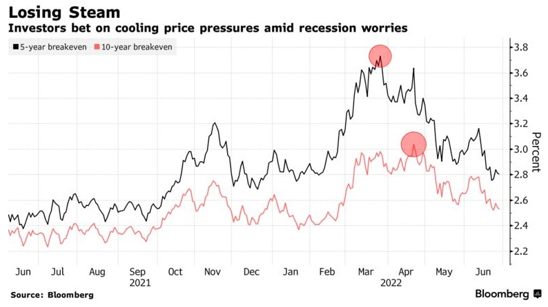 有分析认为,这一次促使市场有如此预期的依据是消费者的反应,物价的飙升抑制了消费者的需求。从而导致5年期和10年期的平衡通胀率已回落至2月份乌俄冲突加剧之前的水平(如上图)。