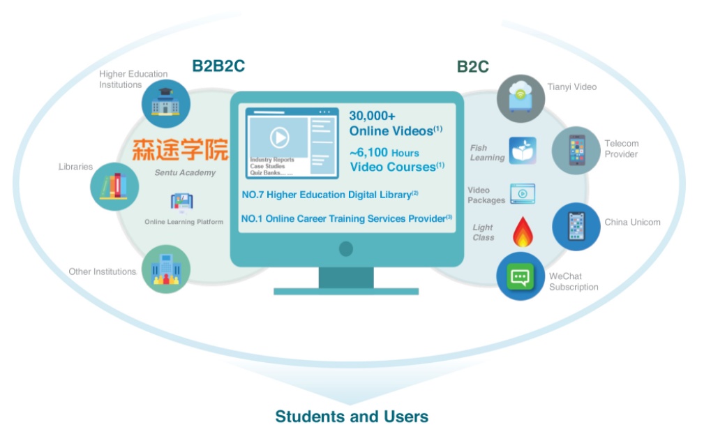 见知教育通过B2B2C模式以及B2C模式实现对教育内容服务及其他业务的展开。其中,B2B2C模式指的是为国内高校提供在线学习教育的订阅服务,然后以服务费的方式来获得收益,并且公共图书馆、视频网站等机构客户能够在不拥有版权的情况下支付一次性许可费来访问内容,并可以在本地下载和存储此类内容。而B2C模式主要透过天翼视讯平台、电信供应商及微信订阅账号向个人终端客户提供教育内容以及增值移动媒体服务。