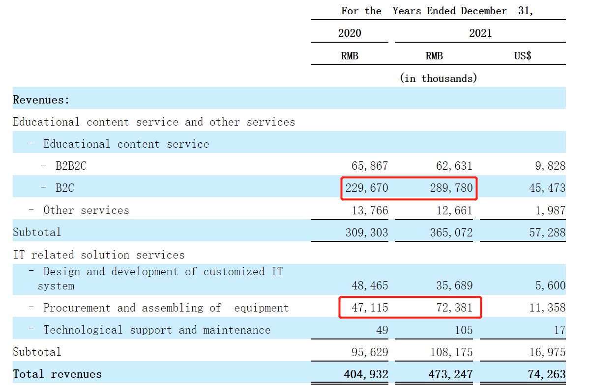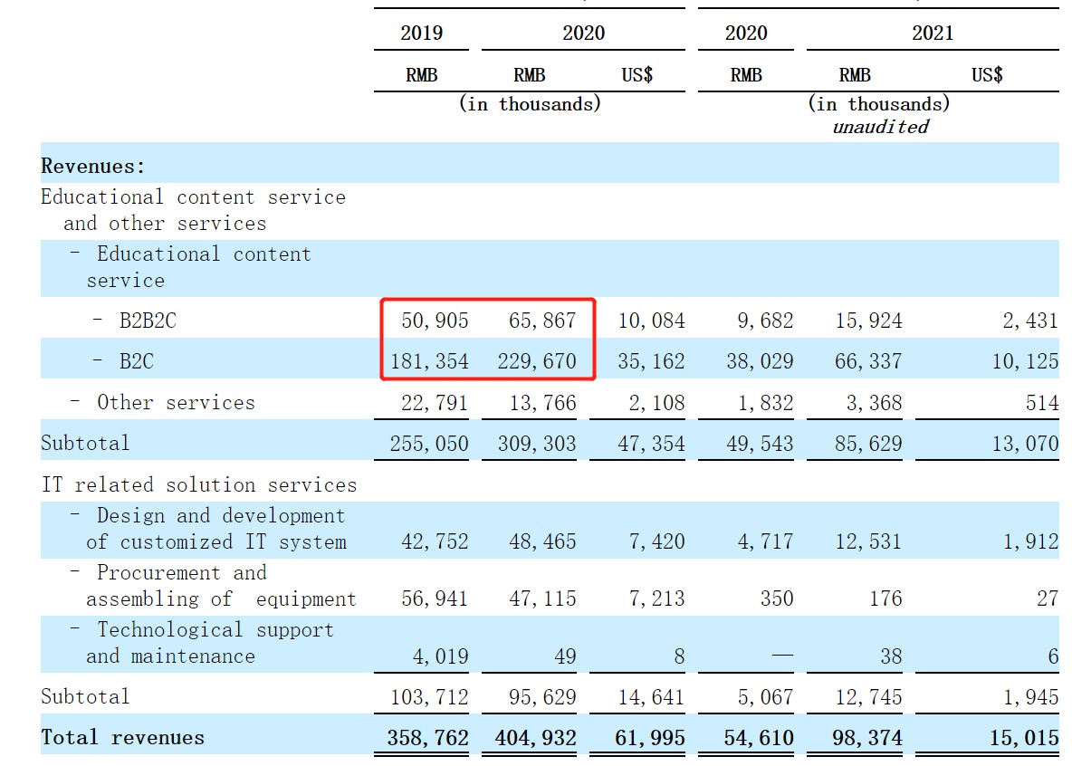 通过对各分部业务的财务数据分析,可更深入挖掘见知教育持续成长的秘密。据招股书显示,2020年时,见知教育的收入为4.05亿人民币,同比增长12.81%,这主要是因为教育内容服务收入的快速增长所带动,IT相关解决方案收入则小幅下滑。