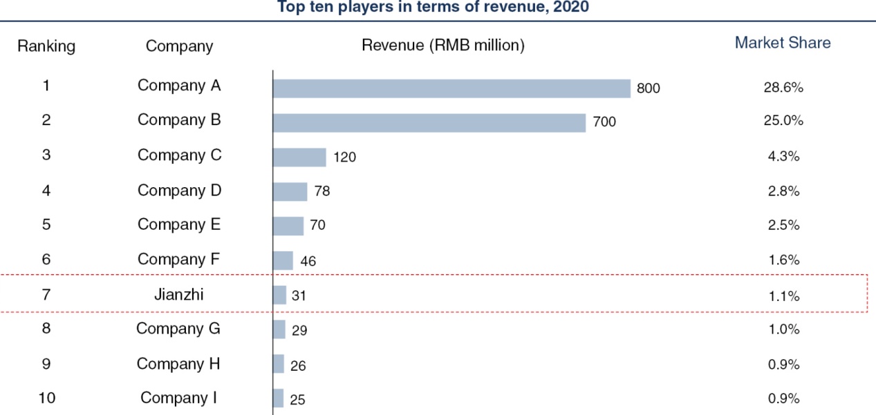 据招股书显示,在面向中国高等教育机构的在线培训服务市场中,见知教育已是该领域中的市场领先者。据招股书显示,中国高校的在线职业培训服务市场高度集中,2021年前四名的总收入占比为83%,而见知教育2021年以3260万元的收入位列行业第一,占比65.5%。通过反推可得出,2021年面向中国高等教育机构的在线培训服务市场规模不足5000万元,因此面向中国高等教育机构的在线培训服务目前市场规模仍较小。