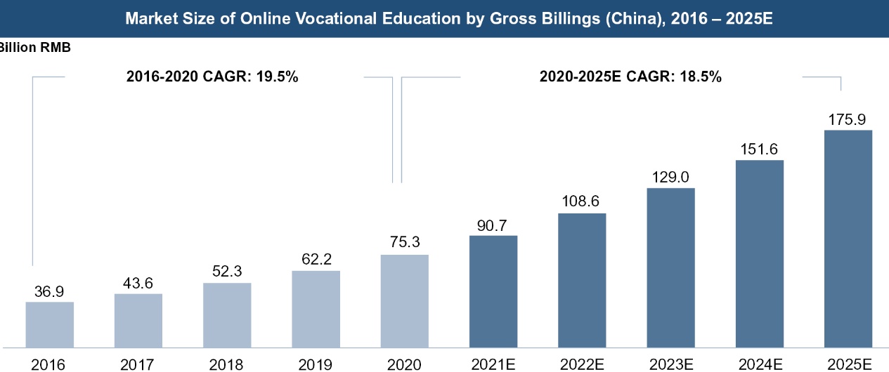 而在在线职业教育赛道中,据弗若斯特沙利文数据显示,该市场的规模容量将从2020年的753亿元增至2025年的1759亿元,年复合增速18.5%,千亿级别的市场仍以两位数快速成长,称之为“黄金赛道”也不为过。