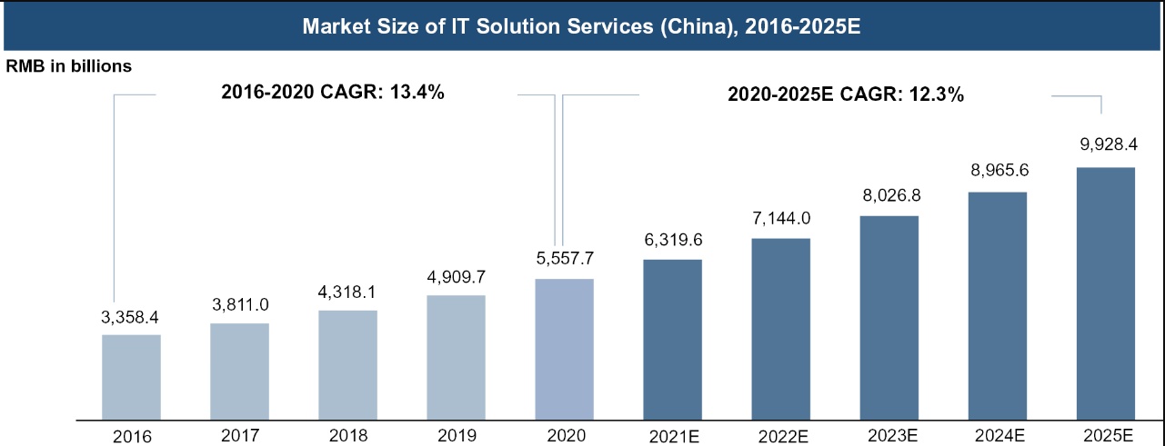 IT解决方案亦是持续成长的市场。虽然中国的IT解决方案市场在过去几十年中经历了快速增长,但由于5G和云计算等信息技术的进步,中国的IT解决方案服务市场有望在未来十年内进一步扩大,其2020年至2025年的市场增速为12.3%,但众所周知,剧烈竞争是该行业的常态。