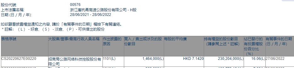 智通财经APP获悉,香港联交所最新资料显示,6月27日,招商公路增持浙江沪杭甬(00576)146.40万股,每股作价7.1420港元,总金额约为1045.59万港元。增持后其持股数目约为2.30亿股,最新持股比例为16.06%。