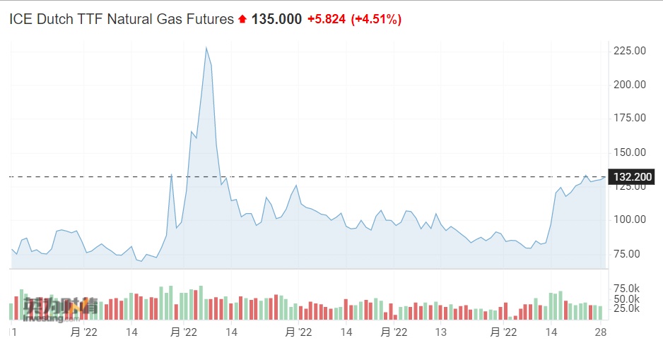 智通财经APP获悉,由于市场担忧欧洲大陆天然气供应形势可能会出现恶化,欧洲天然气价格周三上涨。截至发稿,作为欧洲基准的荷兰近月天然气期货价格上涨4.51%,至每兆瓦时135.00欧元。
