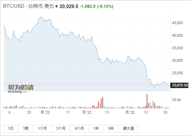 智通财经APP获悉,比特币价格自本月初从3万美元左右下跌至约2万美元以来,近期一直徘徊在20130美元到20429美元之间,截至发稿,比特币价格下跌5.13%,报20029.5美元/枚。由于比特币价格无法获得上涨动力,加剧了分析师对该加密货币进一步下跌的担忧。