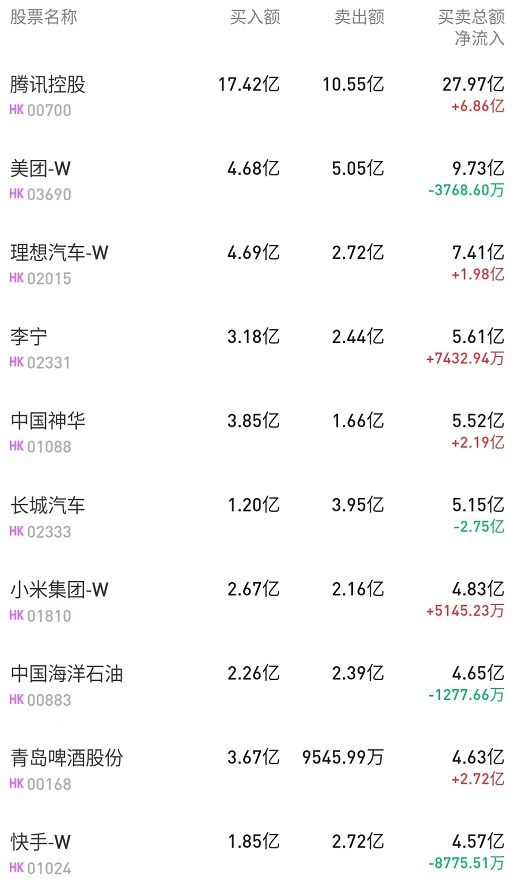 此外,李宁(02331)、小米集团-W(01810)分别获净买入7432万、5145万港元。而长城汽车(02333)、中国移动(00941)、中海油(00883)分别遭净卖出2.74亿、2.38亿、1277万港元。