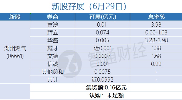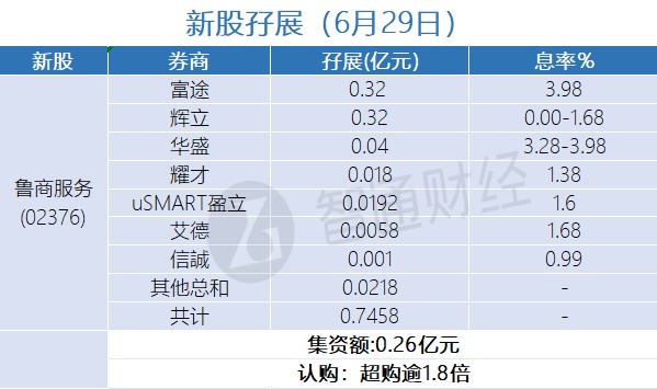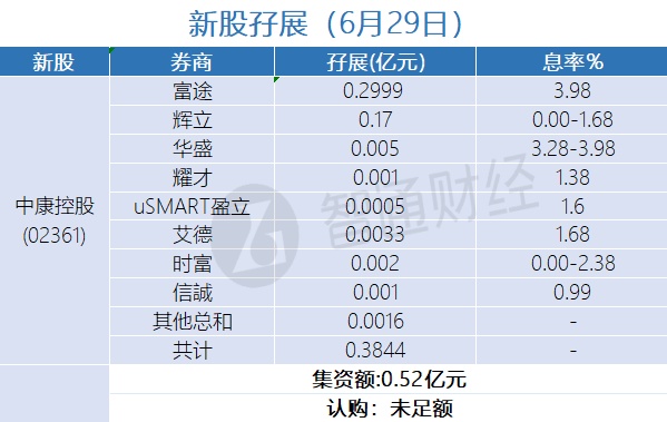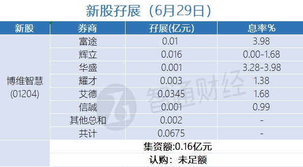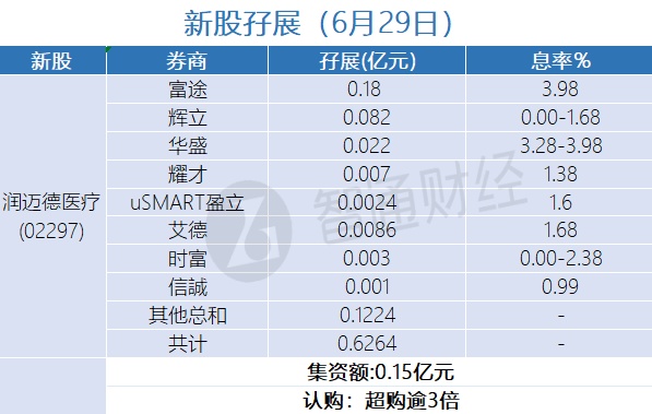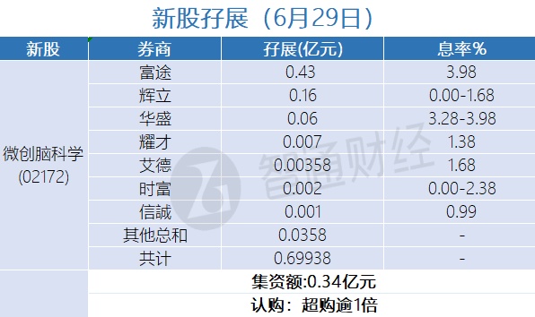 智通财经APP获悉,玄武云(02392)、润迈德医疗(02297)、鲁商服务(02376)、中康控股(02361)、博维智慧(01204)、湖州燃气(06661)及微创脑科学(02172)正在招股中。截至6月29日,富途、辉立、华盛、耀才证券等合计为玄武云、润迈德医疗、鲁商服务、中康控股、博维智慧、湖州燃气及微创脑科学分别借出孖展5.6972亿、0.6264亿、0.7458亿、0.3844亿、 0.0675亿、0.0992、0.69938亿港元。玄武云超购逾22倍、润迈德医疗超购逾3倍、鲁商服务超购逾1.8倍、微创脑科学超购逾1倍、中康控股、博维智慧、湖州燃气认购未足额。