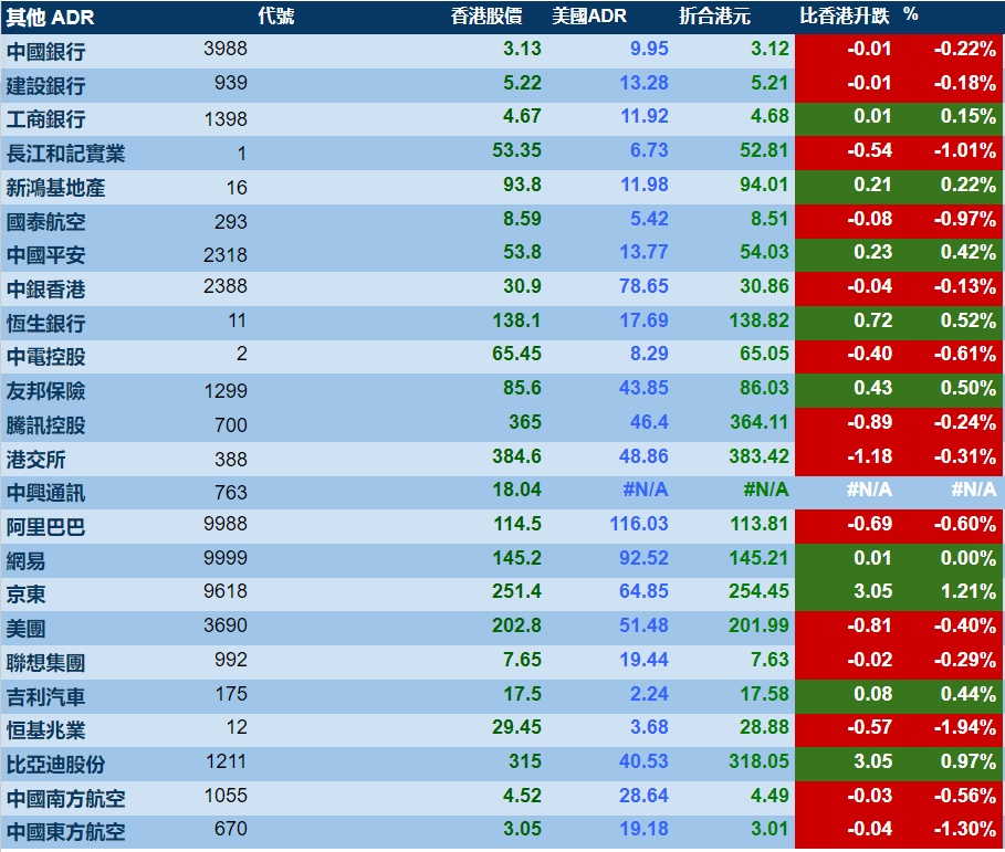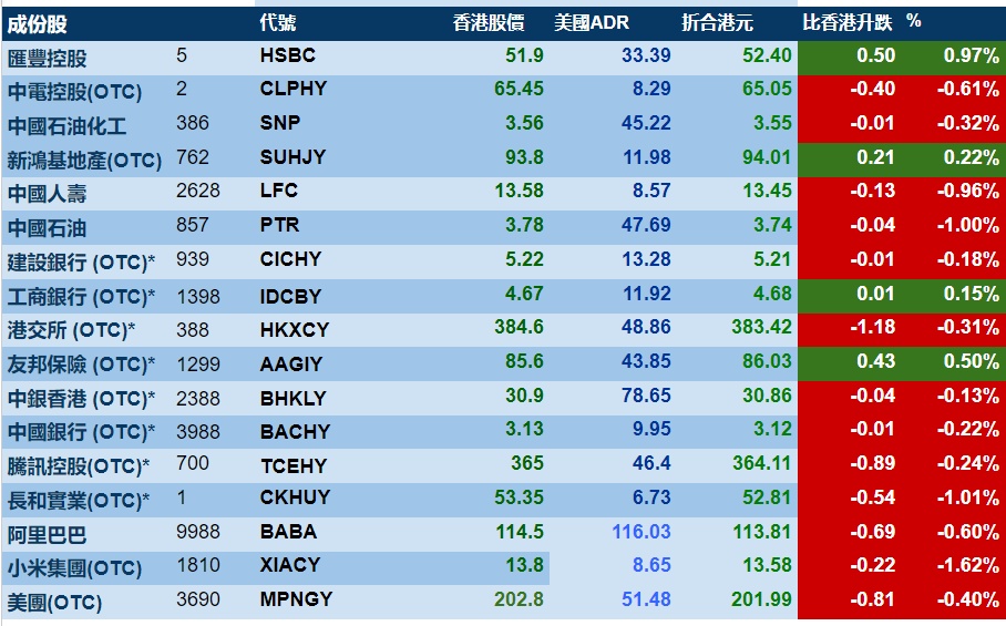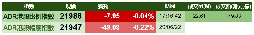智通财经APP获悉,周三美股三大指数涨跌不一,港股ADR指数下跌,按比例计算,收报21988点,较香港收市跌7.95点或0.04%。