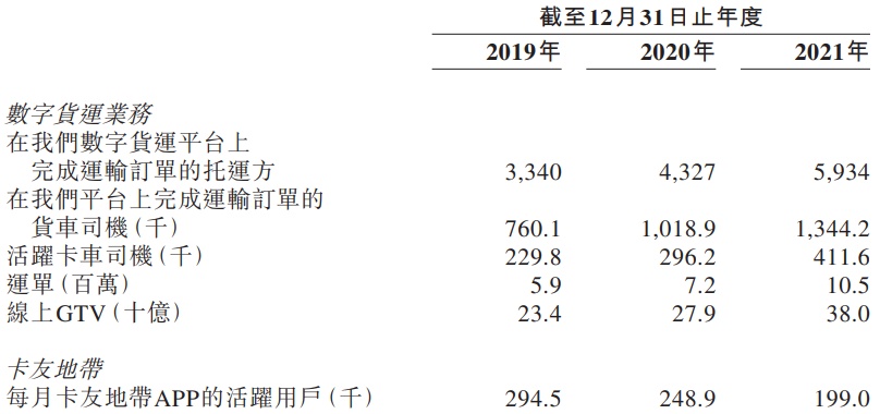 公司的业务主要由三个部分组成:数字货运业务、卡友地带及卡加车服。下表载列公司截至2019年、2020年及2021年12月31日止三个年度期间的若干关键运营指标。