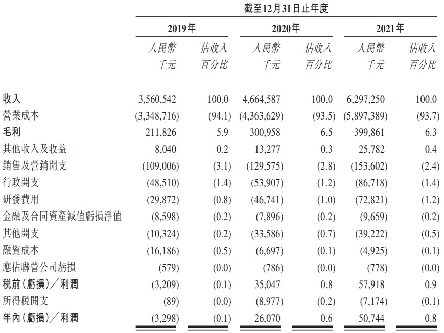 财务方面,公司的收入从2019年的人民币35.61亿元增长到2021年的人民币62.97亿元,年复合增长率达到33.0%。于2019年、 2020年及2021年,公司分别录得净亏损人民币329.8万元、净利润人民币2607万元及净利润人民币5074.4万元。