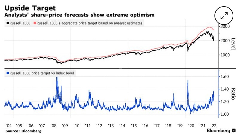 在目前的股市抛售潮下,罗素1000指数成分股中有33家公司预计将反弹100%或更多,同时,分析师一致认为上涨50%的股票有数百只。总而言之,在罗素1000暴跌21%之后,成分股的目标价中值较当前水平高出32%,年初时为12%。然而,历史清楚地表明:尽管少数人可能成功预言市场将反弹,但多数人的反弹预期通常是错误的。