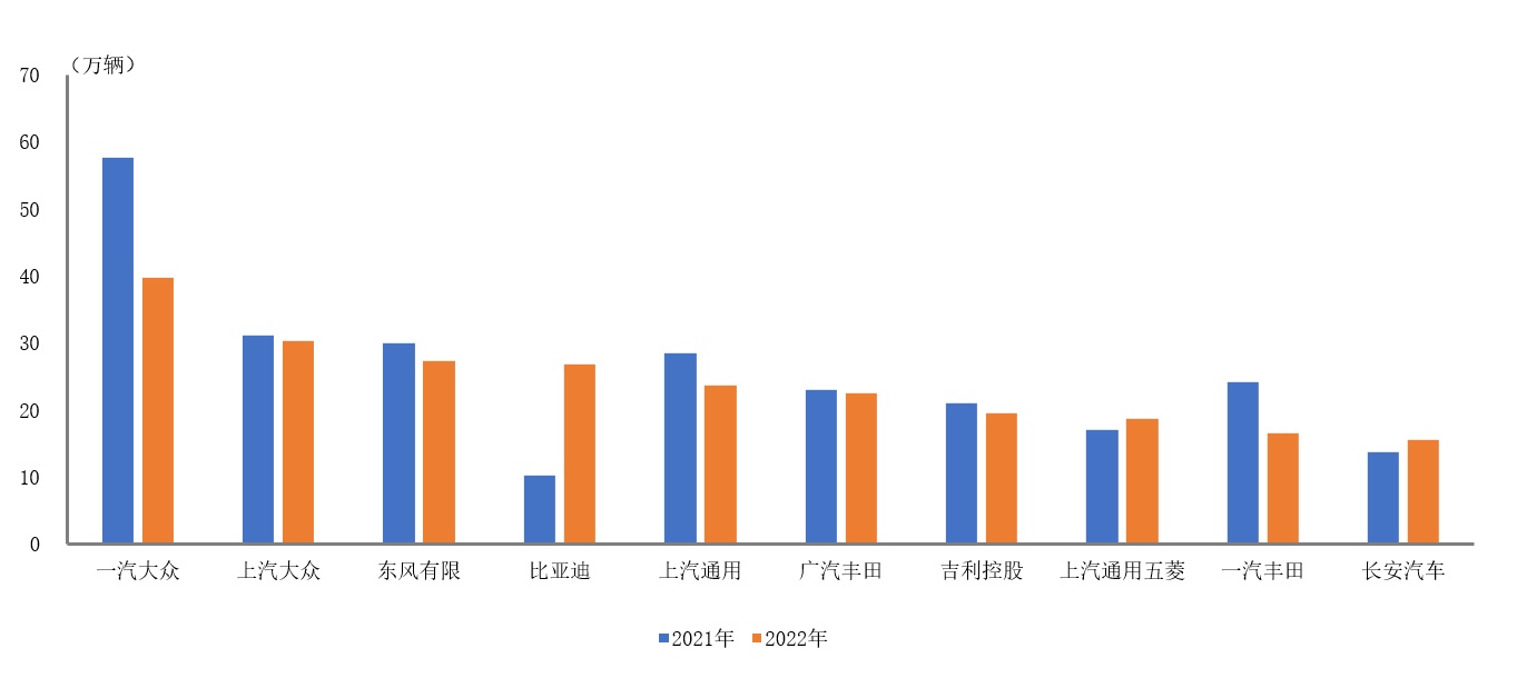 智通财经APP获悉,据中国汽车工业统计分析,2022年1-5月,销量排名前十位的轿车生产企业共销售240.8万辆,占轿车销售总量的62.6%。在销量排名前十位的轿车生产企业中,与上年同期相比,比亚迪(002594.SZ)销量增速依然最为显著,长安汽车(000625.SZ)和上汽通用五菱也呈两位数较快增长,其他企业均呈下降。