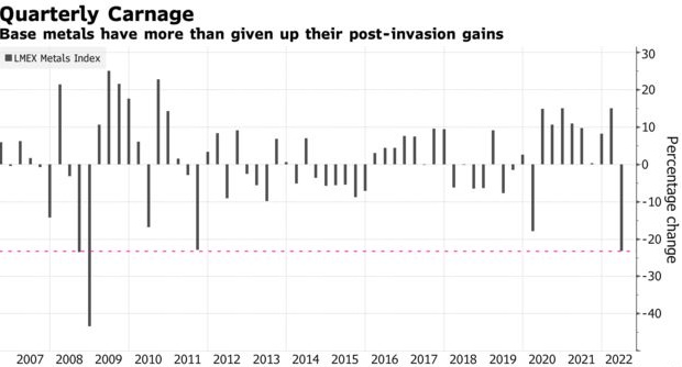 智通财经APP获悉,由于市场对全球经济衰退的担忧加剧,贱金属一度走向2008年全球金融危机以来最严重的季度下挫。自3月底以来,伦敦金属交易所指数下跌了23%,不过由于俄乌战争,3月份金属价格飙升,导致跌幅进一步扩大。锡的表现最差,跌了38%,铝的跌幅约为三分之一,铜的跌幅约为20%。
