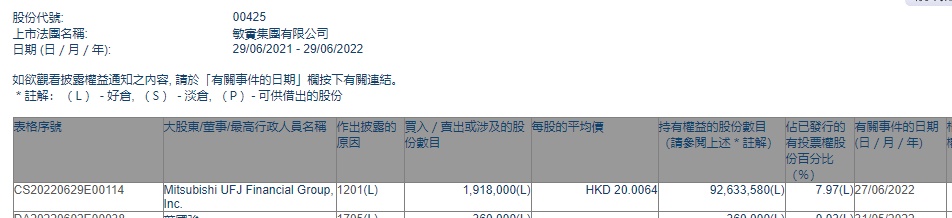 智通财经APP获悉,香港联交所最新资料显示,6月27日,Mitsubishi UFJ Financial Group, Inc.减持敏实集团(00425)191.80万股,每股作价20.0064港元,总金额约为3837.23万港元。减持后最新持股数目约为9263.36万股,最新持股比例为7.97%。