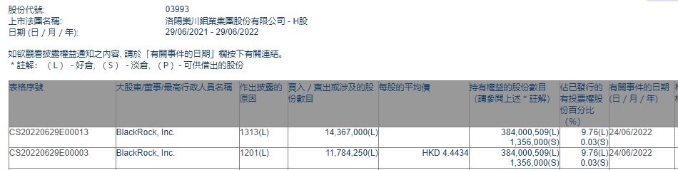智通财经APP获悉,香港联交所最新资料显示,6月24日,贝莱德减持洛阳钼业(03993)1178.425万股,每股作价4.4434港元,总金额约为5236.21万港元。减持后最新持股数目约为3.84亿股,最新持股比例为9.76%。