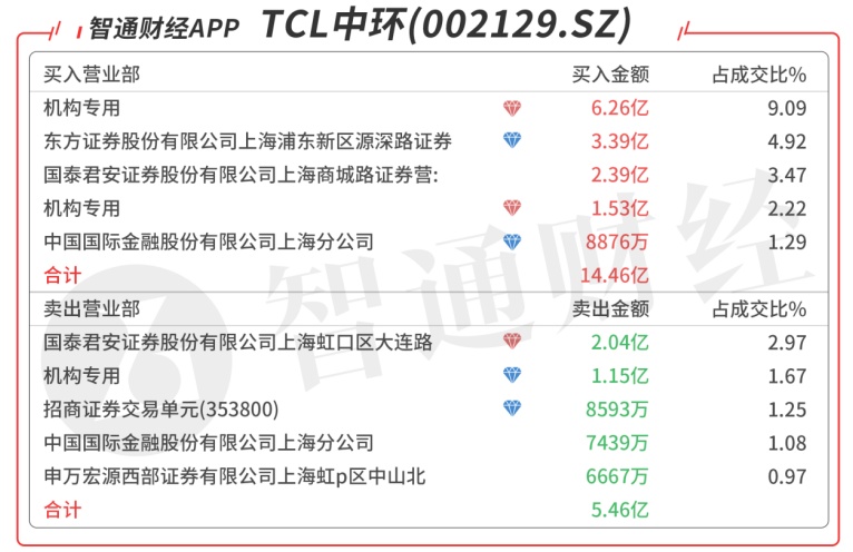 TCL中环(002129.SZ):龙虎榜阵容豪华,3家机构席位合计净买入6.66亿元,买二是知名游资的席位买入3.26亿元,当日净买入9.76亿元,该股今日创历史新高,中线可期。