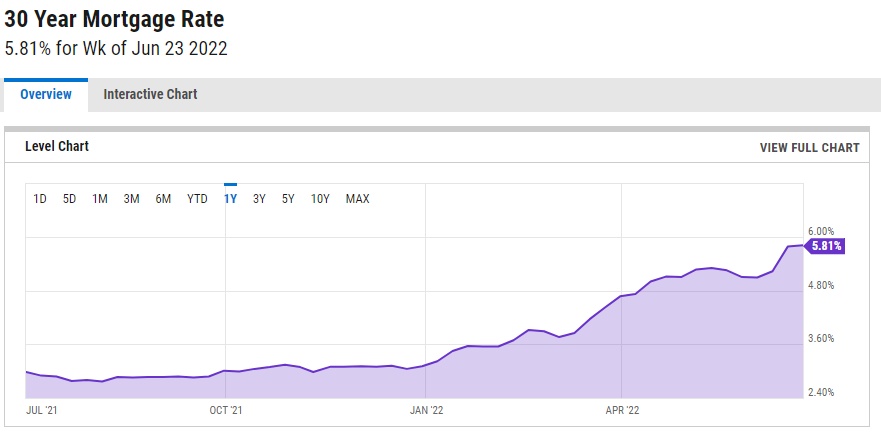 美联储正采取激进加息措施来遏制高通胀率,这也使得美国火热的房地产市场迅速降温。其背后逻辑在于:基准利率上调导致抵押贷款成本飙升,截至6月23日,美国30年期抵押贷款利率已升至5.81%,这使购房者更难以承担购房压力,并迫使潜在买家离场观望。这意味着房屋销售速度没有那么快,而之前挂牌出售的房屋卖家必须与不断增加的新卖家相互竞争。