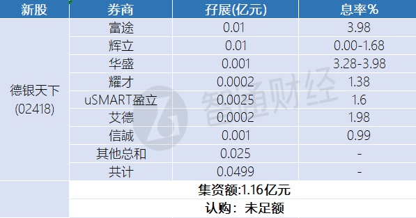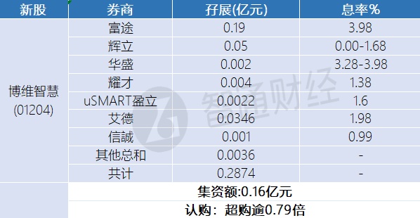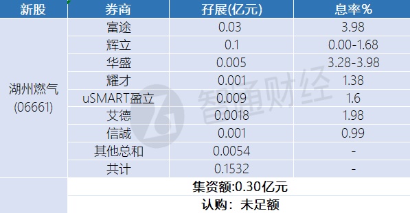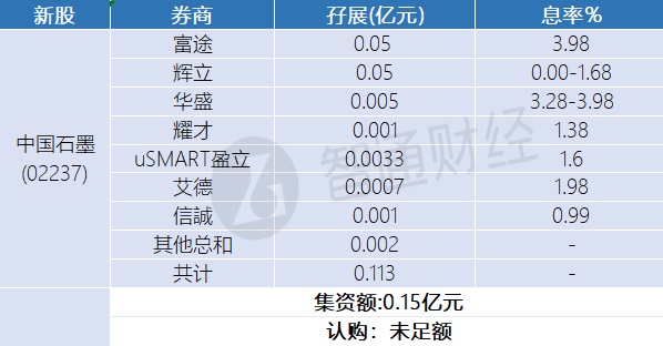 智通财经APP获悉,中康控股(02361)、博维智慧(01204)、湖州燃气(06661)、微创脑科学(02172)、德银天下(02418)及中国石墨(02237)正在招股中。截至6月29日,富途、辉立、华盛、耀才证券等合计为中康控股、博维智慧、湖州燃气、微创脑科学、德银天下及中国石墨分别借出孖展0.4038亿、0.2874亿、0.1532亿、1.1699亿、0.0499亿、0.113亿港元。博维智慧超购逾0.79倍、微创脑科学超购逾2.4倍、中康控股、湖州燃气、德银天下及中国石墨认购未足额。