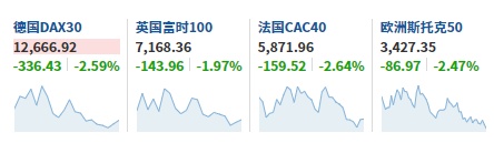 2. 截至发稿,德国DAX指数跌2.59%,英国富时100指数跌1.97%,法国CAC40指数跌2.64%,欧洲斯托克50指数跌2.47%。