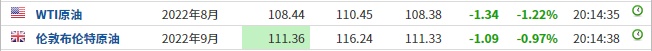 3. 截至发稿,WTI原油跌1.22%,报108.44美元/桶。布伦特原油跌0.97%,报111.36美元/桶。