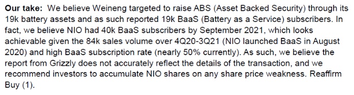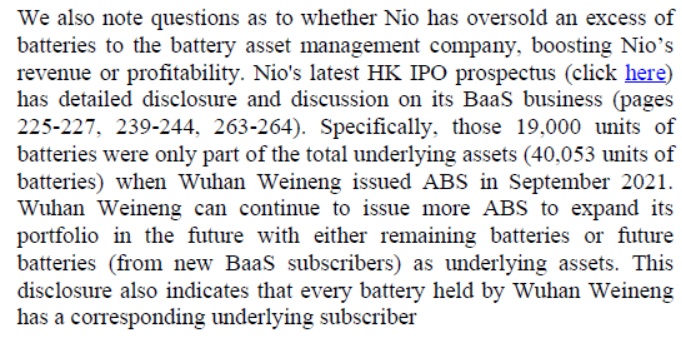 Grizzly Research的做空报告指出,截至2021年9月,蔚来与蔚能通过关联交易形式,出售了4万块电池,而根据蔚能ABS招股说明书,其用于ABS的BaaS订单数为19,000,由此认为蔚来向蔚能过度销售电池,从而夸大自身营业收入和净利润。