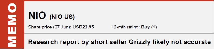 6月28日晚间,美国做空机构Grizzly Research(灰熊)发布报告称,蔚来(09866)通过会计手段夸大了收入和净利润率,从而达到市场预期。灰熊此举引发多家国际大行反驳,包括Morgan Stanley(摩根斯坦利)、JP Morgan(JP摩根)、Daiwa Capital Markets(大和资本市场)等机构,均发布报告称,不支持Grizzly Research的报告结论。
